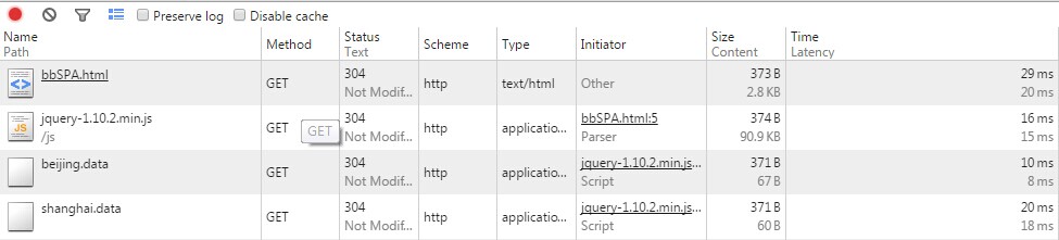 頁面首次載入,雖然我們?cè)L問的URL是"http://localhost:8888/bbSPA.html",但是,實(shí)際URL確是: