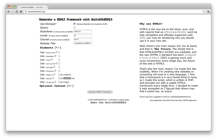 Switch To HTML5是一個(gè)基礎(chǔ)而有效模板生成工具。如果你開始一個(gè)新項(xiàng)目,可以到這里獲取免費(fèi)的HTML5網(wǎng)站模板。