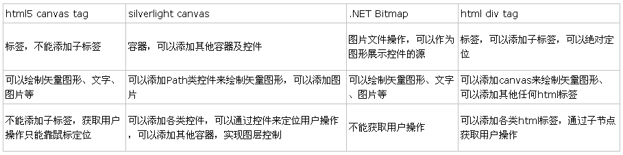 canvas具有繪圖的功能,但是在用戶交互上似乎比較乏力。拿silverlight的canvas、.NET的Bitmap、html的div與canvas對(duì)比了一下: