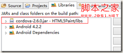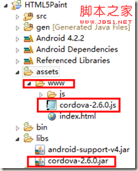把lib/android目錄下的cordova-2.6.0.js復(fù)制到這個(gè)目錄下。把cordova-2.6.0.jar復(fù)制到libs目錄下。