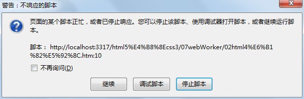 在HTML4中,js創(chuàng)建的程序都是單線程的,如果花費時間比較長的話web界面就會長時間沒有響應(yīng),最惡劣的情況還會跳出一個腳本提示框: