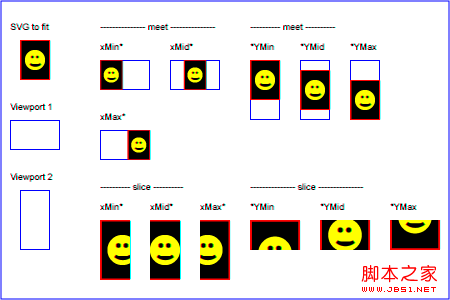 xMidYMin - 強(qiáng)制統(tǒng)一縮放,并且把vivewBox中X方向上的中點(diǎn)對齊到viewport的X方向中點(diǎn)處,簡言之就是X方向中點(diǎn)對齊,Y方向與上面相同。