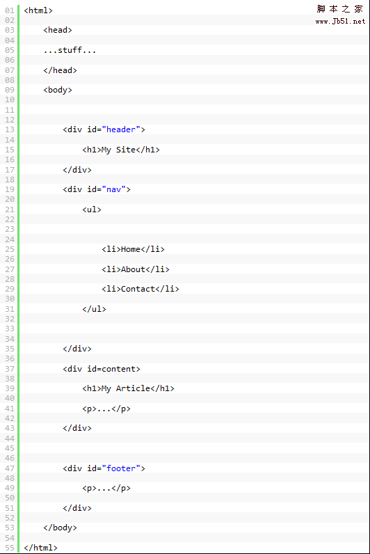 上面的例子中,我們?yōu)槲覀兯械慕Y(jié)構(gòu)div添加了ID。這在有見識(shí)的設(shè)計(jì)師中是很平常的事。目 的有兩個(gè)方面,首先,ID提供了可以能用于給頁面的特殊段落應(yīng)用樣式的錨,其次,ID充當(dāng)基本的偽語義結(jié)構(gòu)。高明的解析器將會(huì)查看標(biāo)簽的ID屬性,并嘗試 去猜測(cè)他們的含義,但當(dāng)每個(gè)站點(diǎn)的ID名稱不同的時(shí)候很難。
