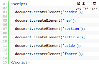 我們只需要讓IE去給我們使用createElement方法創(chuàng)造的的HTML 5標(biāo)簽設(shè)置樣式。在HTML 5文件的head標(biāo)簽內(nèi)添加這點(diǎn)東西。或者,你可以把他保存在一個(gè)特定的文件里,并用這種方法包含。