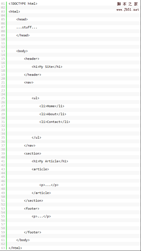 非常清楚,并且容易理解,不是么?一些注釋:我們可以在header標(biāo)簽中包含我們 的<h1>My Article</h1>標(biāo)題。我沒有這樣做,因?yàn)閔1元素已經(jīng)表達(dá)了標(biāo)題的含義,但如果你還有發(fā)布日期,署名或者其他數(shù)據(jù)在你文章的頂部, 為標(biāo)簽集添加一個(gè)header容器標(biāo)簽是一個(gè)很好的選擇。
