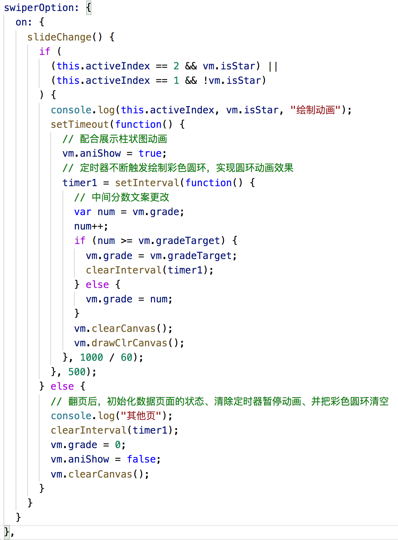 總而言之,當(dāng)滿(mǎn)足條件、用戶(hù)翻到canvas所在swiper頁(yè)面后,我就要觸發(fā)if里邊的圓環(huán)繪制邏輯。否則就走到else里初始化數(shù)據(jù)頁(yè)面的狀態(tài)、清除定時(shí)器暫停動(dòng)畫(huà)、并把彩色圓環(huán)清空