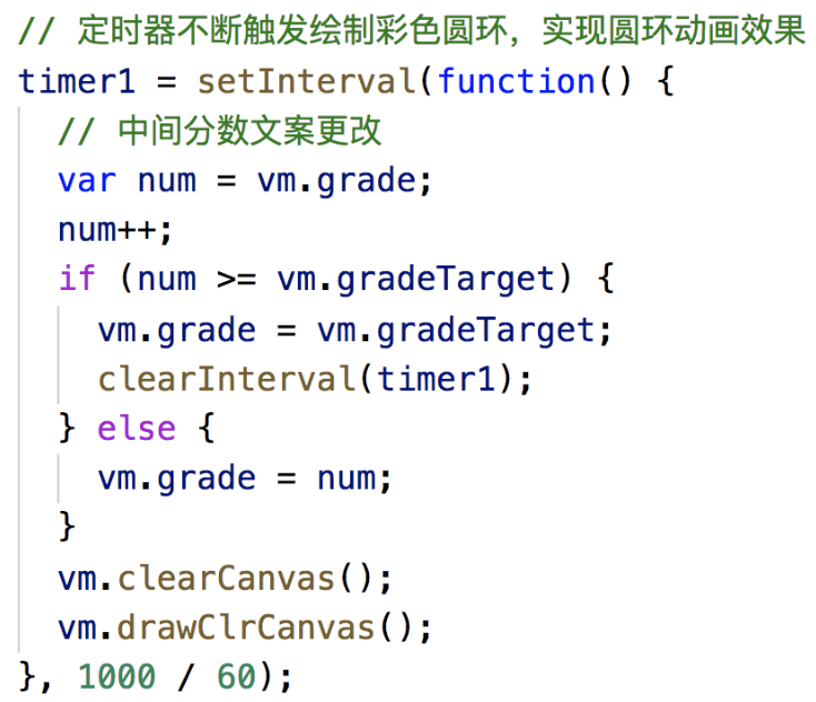 其實(shí)沒(méi)必要在定時(shí)器里重新調(diào)用彩色圓環(huán)繪制方法。我們直接改的是this.grade屬性,監(jiān)聽(tīng)這個(gè)屬性的改變就好了其實(shí)。這樣此屬性在定時(shí)器中被修改,圓環(huán)方法就會(huì)自動(dòng)執(zhí)行。
