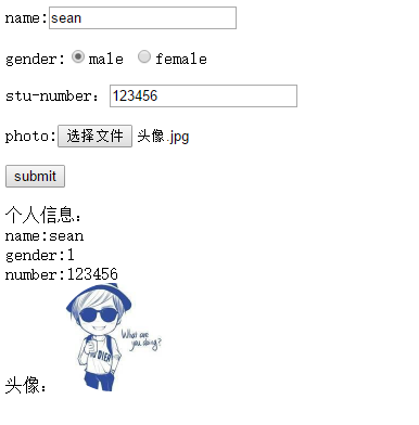 填寫好信息后,點擊 submit,頁面中能得到以下效果,去服務(wù)器端對應(yīng)的文件夾下也能發(fā)現(xiàn)上傳的圖片。