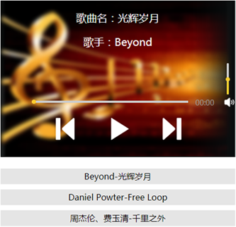 這個(gè)音樂(lè)播放器的結(jié)構(gòu)主要分為三部分:歌曲信息、播放器和播放列表,我們重點(diǎn)介紹一下播放器部分。首先在播放器中放三個(gè)audio標(biāo)簽用于播放: