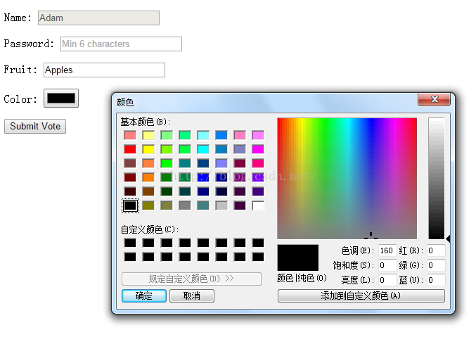 type屬性為color表示顏色選擇器,顏色值以7個字符的格式表示:以#開頭,接下來是三個兩位十六進制數(shù),分別代表紅、綠、藍三種原色的值,如#FF1234。