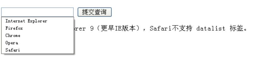 <p><strong>注意:</strong> Internet Explorer 9(更早IE版本),Safari不支持 datalist 標(biāo)簽。</p>