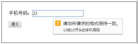 <p>手機號碼:<input type="text" name="phoneNumber" pattern="[1]([3]|[5])[0-9]{9}" title="13或15開頭的手機號碼" /></p>