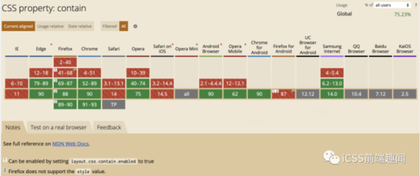 截止至 2021-04-27,Can i Use 上的 CSS Contain 兼容性,已經(jīng)可以開始使用起來: