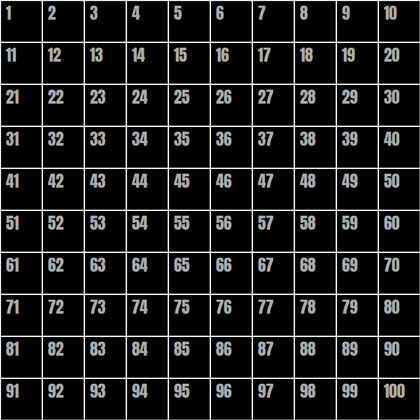 從左到右按順序排列著白色邊框和數(shù)字的黑色十乘十方格。