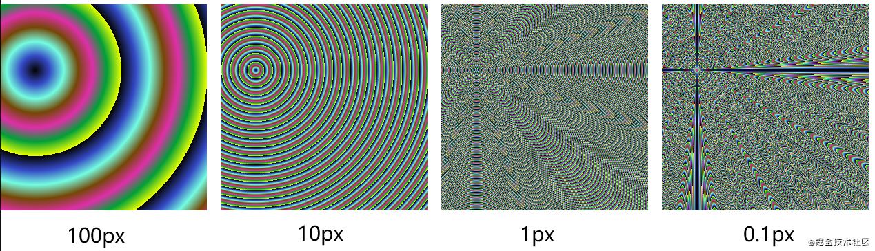 在上述 DEMO 中,我們發(fā)現(xiàn),當(dāng)在 0.001px 到 0.0001px 這個區(qū)間段,repeating-radial-gradient 基本退化為了粒子圖形: