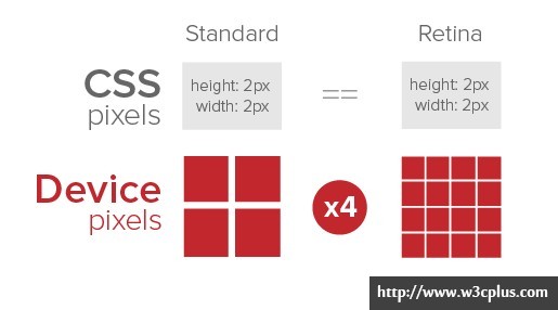 在 Apple 的視網膜屏(Retina)中,每 4 個像素為一組,渲染出普通屏幕中一個像素顯示區(qū)域內的圖像,從而實現更為精細的顯示效果。此時, 250px 的元素跨越了 500 個物理像素的寬度。