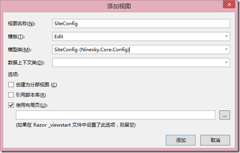 在Ninesky.Web/Areas/Control/Controllers【右鍵】->添加->控制器,輸入控制器名ConfigController。