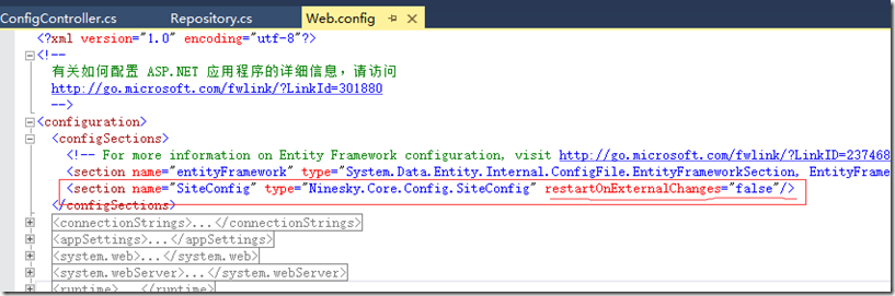 打開Nniesky.web項目的 web.config文件,找到configSections,然后添加SiteConfig配置節(jié)