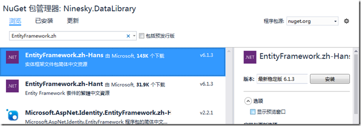 在搜索框輸入EntityFramework.zh-Hans,安裝假體中文資源包。