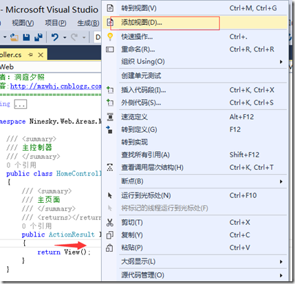 在Home控制器的 Index 方法上點(diǎn)右鍵->添加視圖。