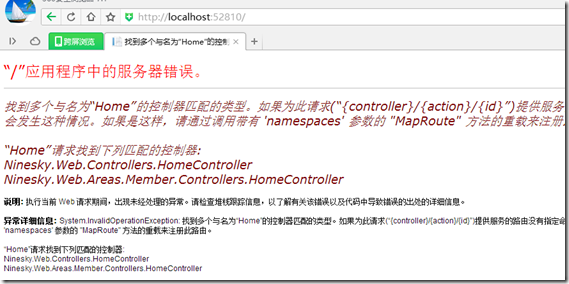 按F5,運(yùn)行項(xiàng)目,在瀏覽器中查看一下 http://localhost:52810/Home/Index。嗯,出錯(cuò)了,意思說Home找到兩個(gè)匹配的控制器。