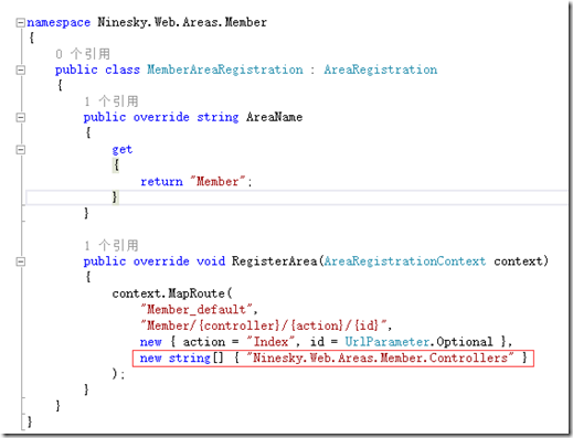 打開 Ninesky.Web->Areas->Member->MemberAreaRegistration.cs