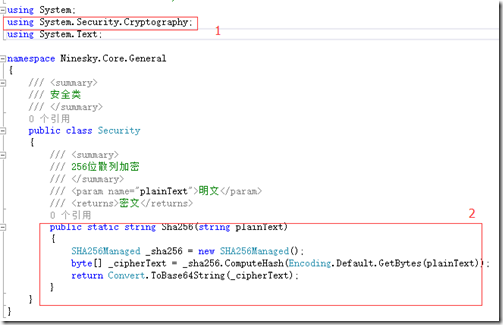 引用System.Security.Cryptography命名空間(1),并實(shí)現(xiàn)SHA256靜態(tài)加密方法。
