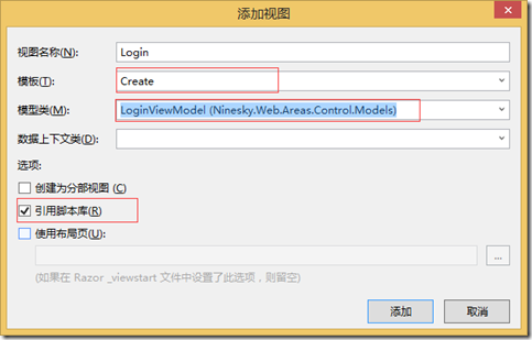 模板選Create,模型類(lèi)選LoginViewModel ,選項(xiàng)選中引用腳本庫(kù)。完成后代碼