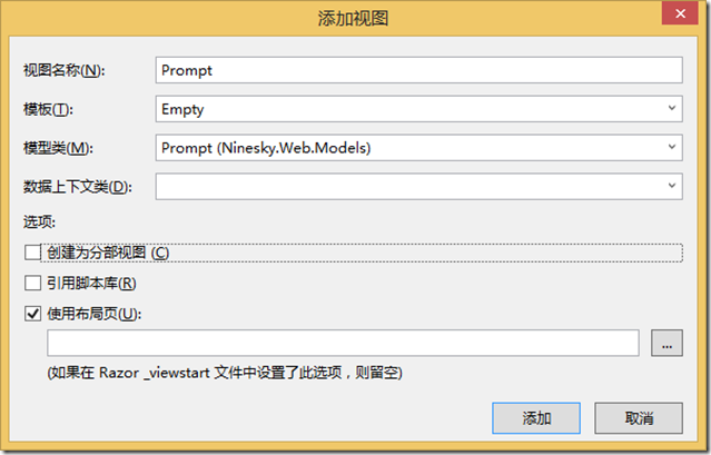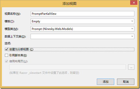 Ninesky.Web/Areas/Control/Views/Shared【右鍵】->添加->視圖。視圖名為PromptPartialView。
