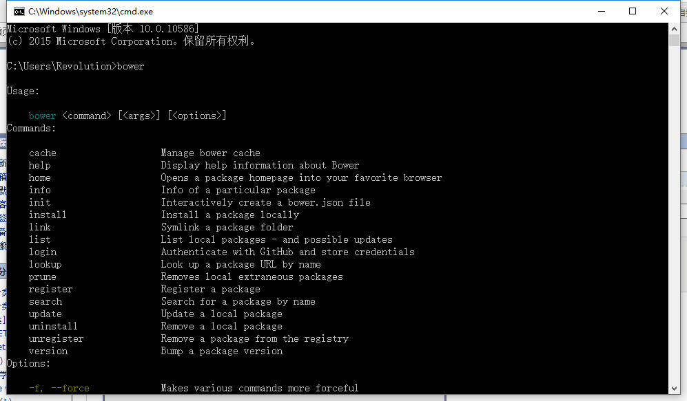 可是之前明明安裝過 bower 這是怎么回事呢 不急,打開 控制臺(tái) 輸入 bower 檢查一下