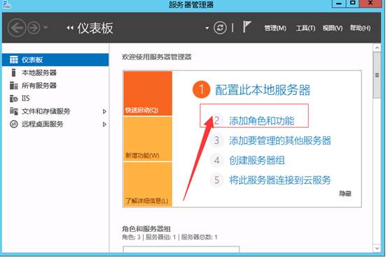 打開服務(wù)器管理器,點(diǎn)擊添加角色和功能。