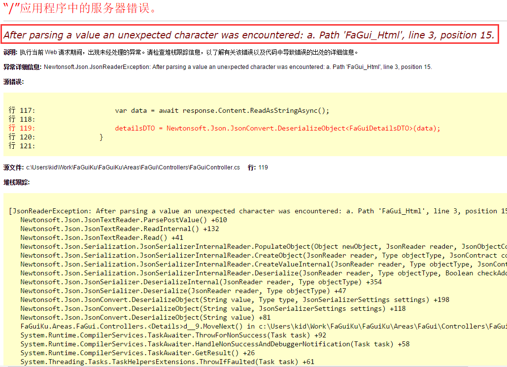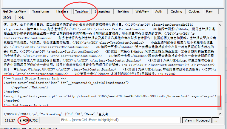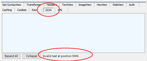 于是我用Fiddler 4直接調(diào)用這個(gè)WebApi,狀態(tài)碼是200(正常的),JSon里卻提示在位置9409處文本非法,