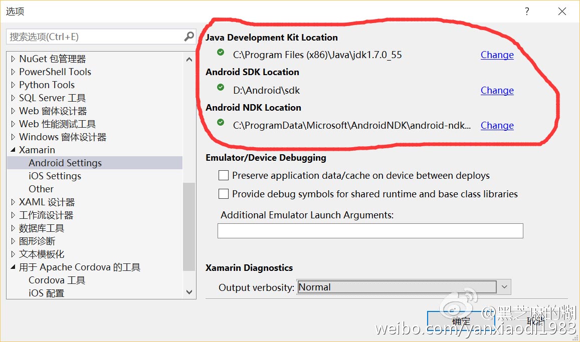 然后再改vs的設(shè)置,cordova設(shè)置和xamarin設(shè)置里把下載好的Android sdk路徑改一下。最后再從控制面板找vs安裝程序,修改,翻墻,把安裝失敗的git選上,再裝一下就可以了。