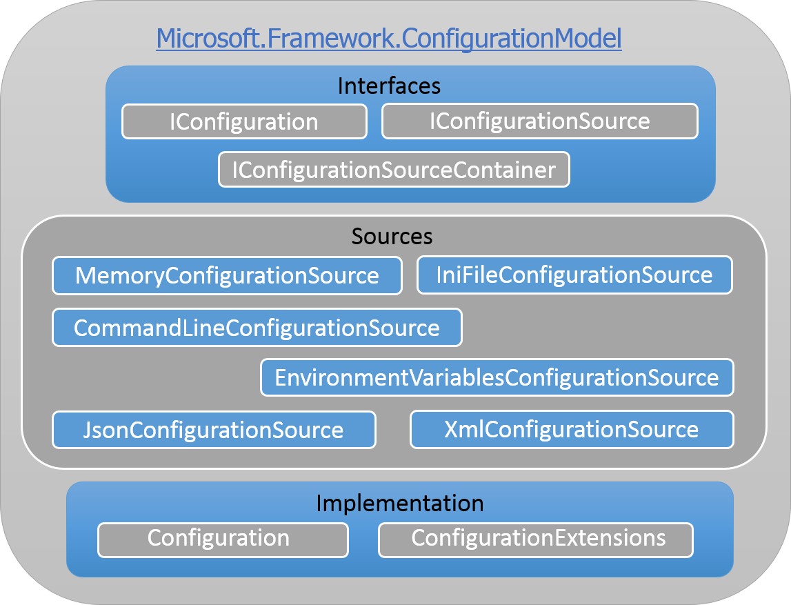 在Microsoft.Framework.ConfigurationModel命名空間下,目前有6種不同類型的配置源類型可以使用,分別如下: