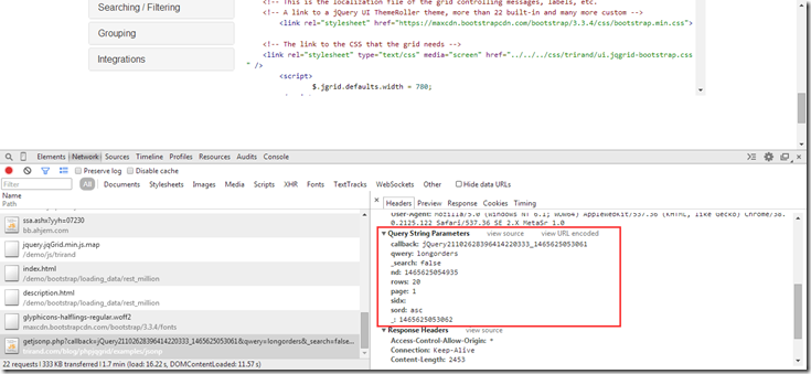 6.前端HTML頁(yè)面調(diào)用以及js部分: 需要說(shuō)明一點(diǎn)的是:http://www.guriddo.net/demo/bootstrap/DEMO中的實(shí)例使用的是php的后臺(tái)數(shù)據(jù)格式為 datatype: "jsonp";而我這里MVC返回要改成 datatype:"json",為了這個(gè)問(wèn)題我弄了好久,痛苦。