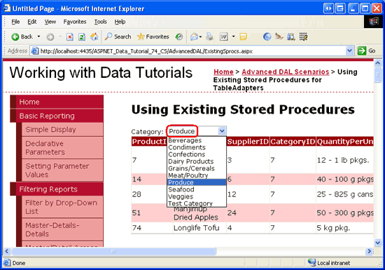 圖6:ExistingSprocs.aspx頁面最開始顯示的是 飲料類的產(chǎn)品