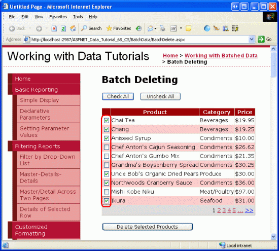 完成上述工作后,花幾分鐘在瀏覽器里測試該頁面.你應該首先看到一個GridView控件列出了前10個產(chǎn)品,每行列出了產(chǎn)品的name, category,price以及一個checkbox. 同時應該有3個按鈕“Check All”, “Uncheck All”和“Delete Selected Products”.點“Check All”按鈕將會選中所有的checkboxes;而“Uncheck All”按鈕將釋放所有的