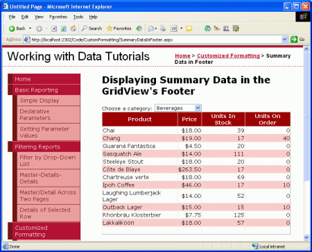 在本節(jié)教程中,我們將會看到如何去征服這些挑戰(zhàn)。另外呢,我們將創(chuàng)建一個頁面,它含有一個列出所有“類別”的下拉框,選擇一個“類別”就可以在GridView中顯示這個類別的產(chǎn)品。GridView中包含一個頁腳行,用于顯示此類產(chǎn)品的平均價格、庫存總量和訂貨總量。