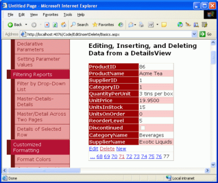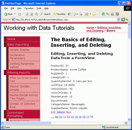 圖24顯示新增一個(gè)產(chǎn)品(Acme Coffee)時(shí)瀏覽器中的FormView。注意顯示在ItemTemplate中的SupplierName和CategoryName字段現(xiàn)在不再顯示了,因?yàn)槲覀儎倓倓h除了它們。當(dāng)點(diǎn)擊插入按鈕時(shí),F(xiàn)ormView執(zhí)行的是與GridView和DetailsView控件相似的一系列的步驟,插入一條新記錄到Products表。圖25顯示了新產(chǎn)品插入成功后在FormView中的詳細(xì)信息。