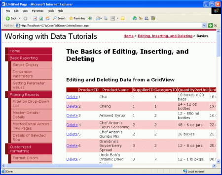 類似在其它文件夾里,EditInsertDelete文件夾里的Default.aspx將列出這些教程章節(jié)。記得用戶控件提供這個(gè)功能。因此,從解決方案資源管理器中拖拽一個(gè)這個(gè)用戶控件到頁(yè)面的設(shè)計(jì)視圖,從而添加它到Default.aspx頁(yè)面。