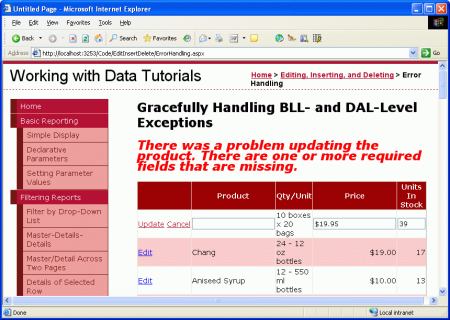 這時(shí)我們的可編輯的GridView在用戶輸入合法的product's name、price和units in stock時(shí)表現(xiàn)極佳,輸入不合法的值時(shí)則導(dǎo)致一個(gè)異常。例如,遺漏了ProductName值則引發(fā)拋出一個(gè)NoNullAllowedException異常,因?yàn)镻rodcutsRow類的ProductName屬性設(shè)置了它的AllowDBNull屬性為false;如果數(shù)據(jù)庫不正常運(yùn)作,則在試圖連接數(shù)據(jù)庫時(shí)通過TableAdapter拋出一個(gè)SqlException異常。沒有任何的動作,這些異常都會從數(shù)據(jù)訪問層冒出到業(yè)務(wù)邏輯層,然后到ASP.NET頁面,最后到ASP.NET運(yùn)行時(shí)。