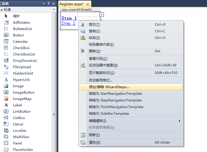 (1)拖放Wizard控件到頁面上,郵件選擇 添加/移除 WizardSteps...