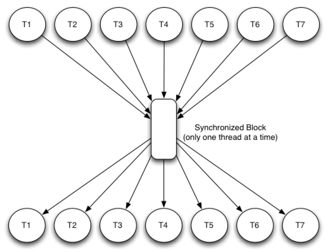 我們有七個線程,都需要訪問一段同步代碼塊,所以它們依次獲得權(quán)限訪問該代碼塊,執(zhí)行其功能,然后繼續(xù)。