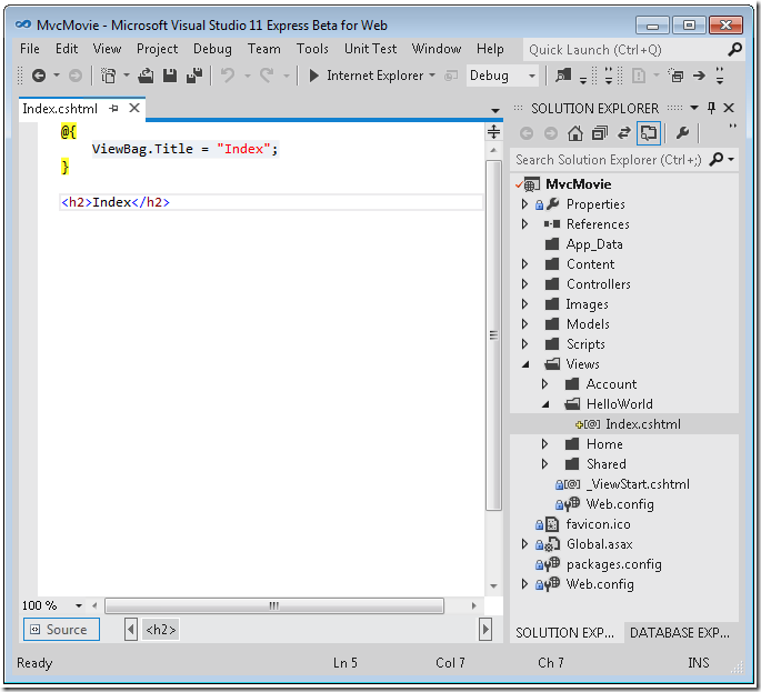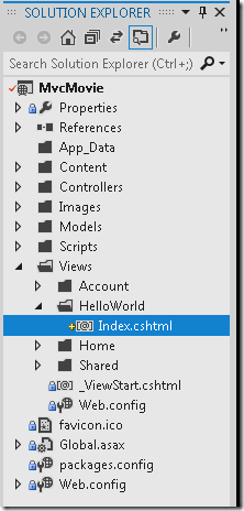 您可以在解決方案資源管理器中看到MvcMovie\HelloWorld文件夾和已被創(chuàng)建的MvcMovie\View\HelloWorld\Index.cshtml文件: