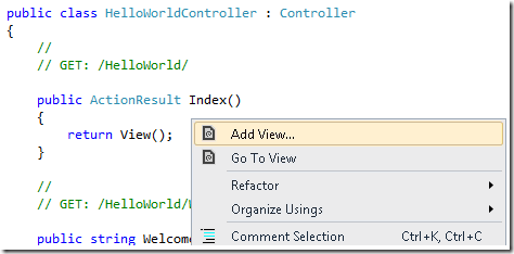 在該項(xiàng)目中,您可以使用的Index方法來(lái)添加一個(gè)視圖模板。要做到這一點(diǎn),在Index方法中單擊鼠標(biāo)右鍵,然后單擊“ 添加視圖“。