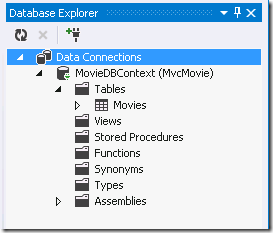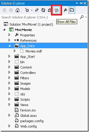 Entity Framework Code First代碼優(yōu)先,如果檢測(cè)到不存在一個(gè)數(shù)據(jù)庫連接字符串指向了Movies數(shù)據(jù)庫,會(huì)自動(dòng)的創(chuàng)建數(shù)據(jù)庫。在App_Data文件夾中找一下,您可以驗(yàn)證它已經(jīng)被創(chuàng)建了。如果您看不到Movies.mdf文件,請(qǐng)?jiān)诮鉀Q方案資源管理器工具欄上,單擊顯示所有文件按鈕,單擊刷新按鈕,然后展開App_Data文件夾。