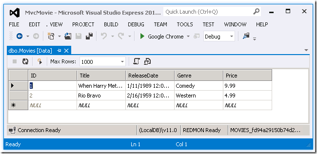 請(qǐng)注意,如何將Movies表的表結(jié)構(gòu)映射到您早些時(shí)候所創(chuàng)建的Movie類?Entity Framework 代碼優(yōu)先為您自動(dòng)創(chuàng)建了基于Movie類的表結(jié)構(gòu)。