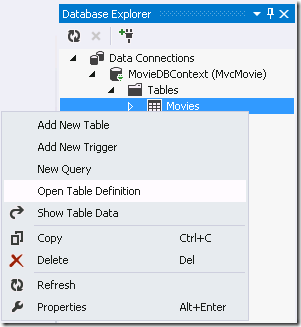 右鍵單擊Movies表,選擇打開表定義查看Entity Framework代碼優(yōu)先所創(chuàng)建表的表結(jié)構(gòu)。