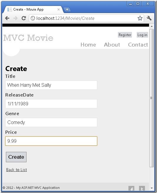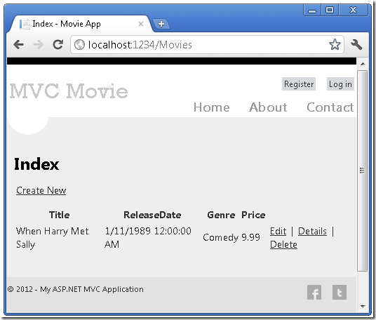 單擊Create按鈕將使得窗體提交至服務(wù)器,同時(shí)電影信息也會(huì)保存到數(shù)據(jù)庫里,然后您會(huì)被重定向到URL/Movies,您可以在列表中看到您剛剛創(chuàng)建的新電影。