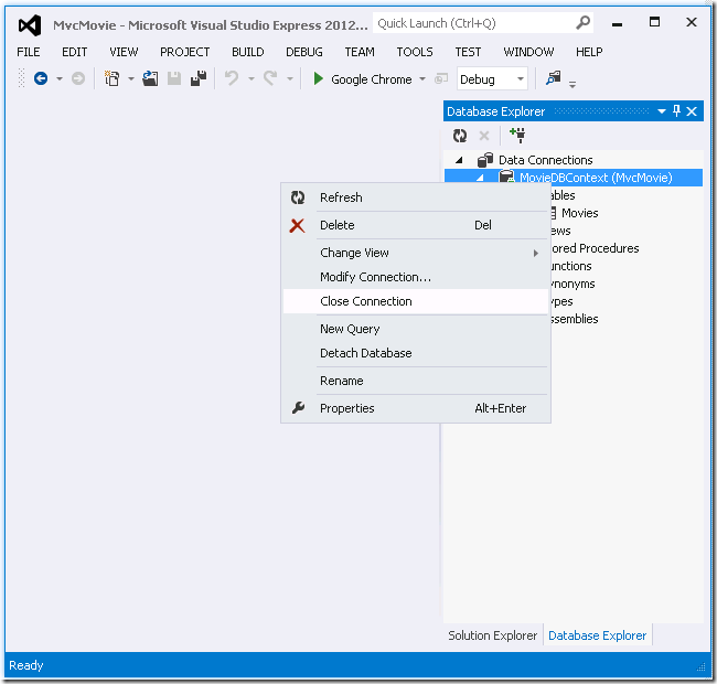 當(dāng)您完成操作后,通過右鍵單擊MovieDBContext ,選擇關(guān)閉連接關(guān)閉該數(shù)據(jù)庫連接。(如果您沒有關(guān)閉連接,當(dāng)您下次運(yùn)行該項(xiàng)目時(shí),可能會(huì)出現(xiàn)錯(cuò)誤)。